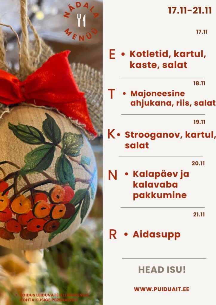 Puiduaida kohvik pakub mõnusaid maitseelamusi. Pakume maitsvaid kooke ja pirukaid, koduleiba ning muud hääd-paremat. Eelneval kokkuleppel saame pakkuda toitlustust kuni 74-liikmelistele gruppidele. Ootame oma sõpru ja külalisi mai algusest septembri lõpuni E–L kell 10–19 P kell 11–17 oktoobri algusest aprilli lõpuni E–R kell 10–17 Muul ajal kokkuleppel. Info ja broneerimine: info@puiduait.ee + 372 33 97 410 Olge valmis vahvateks ja positiivseteks üllatusteks! Menüüd gruppidele: Supp ja magustoit Hind: 4 € Supp valikust: frikadelli, herne või seljanka ja koduleib Magustoit valikust: kohupiim kisselliga või ahjuõunad vaniljekastmes Praad ja magustoit Hind: 5 € 1) Kotlett, kartul, kaste, tomati-kurgisalat, leib Pannkook moosiga, piim 2) Guljašš, makaronid värskekapsa- kurgisalat, leib Marjad kohupiimakastmes 3) Seapraad, kartul, praekapsas, leib Marjad kohupiimakastmes