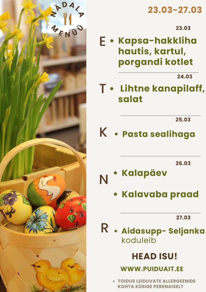 Puiduaida kohvik pakub mõnusaid maitseelamusi. Pakume maitsvaid kooke ja pirukaid, koduleiba ning muud hääd-paremat. Eelneval kokkuleppel saame pakkuda toitlustust kuni 74-liikmelistele gruppidele. Ootame oma sõpru ja külalisi mai algusest septembri lõpuni E–L kell 10–19 P kell 11–17 oktoobri algusest aprilli lõpuni E–R kell 10–17 Muul ajal kokkuleppel. Info ja broneerimine: info@puiduait.ee + 372 33 97 410 Olge valmis vahvateks ja positiivseteks üllatusteks! Menüüd gruppidele: Supp ja magustoit Hind: 4 € Supp valikust: frikadelli, herne või seljanka ja koduleib Magustoit valikust: kohupiim kisselliga või ahjuõunad vaniljekastmes Praad ja magustoit Hind: 5 € 1) Kotlett, kartul, kaste, tomati-kurgisalat, leib Pannkook moosiga, piim 2) Guljašš, makaronid värskekapsa- kurgisalat, leib Marjad kohupiimakastmes 3) Seapraad, kartul, praekapsas, leib Marjad kohupiimakastmes