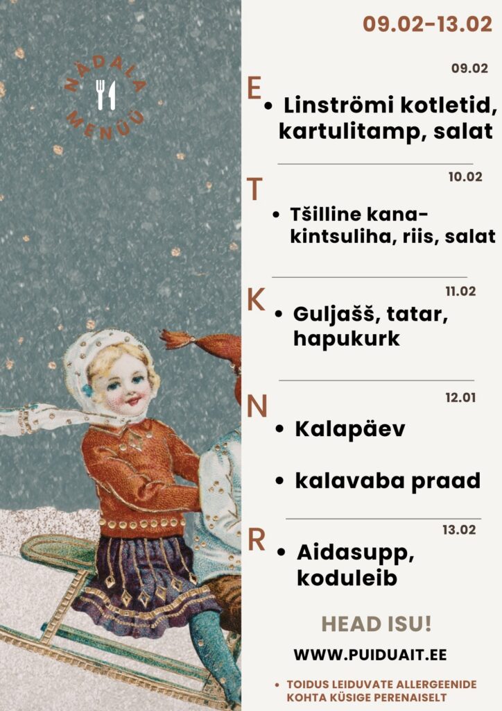 Puiduaida kohvik pakub mõnusaid maitseelamusi. Pakume maitsvaid kooke ja pirukaid, koduleiba ning muud hääd-paremat. Eelneval kokkuleppel saame pakkuda toitlustust kuni 74-liikmelistele gruppidele. Ootame oma sõpru ja külalisi mai algusest septembri lõpuni E–L kell 10–19 P kell 11–17 oktoobri algusest aprilli lõpuni E–R kell 10–17 Muul ajal kokkuleppel. Info ja broneerimine: info@puiduait.ee + 372 33 97 410 Olge valmis vahvateks ja positiivseteks üllatusteks! Menüüd gruppidele: Supp ja magustoit Hind: 4 € Supp valikust: frikadelli, herne või seljanka ja koduleib Magustoit valikust: kohupiim kisselliga või ahjuõunad vaniljekastmes Praad ja magustoit Hind: 5 € 1) Kotlett, kartul, kaste, tomati-kurgisalat, leib Pannkook moosiga, piim 2) Guljašš, makaronid värskekapsa- kurgisalat, leib Marjad kohupiimakastmes 3) Seapraad, kartul, praekapsas, leib Marjad kohupiimakastmes