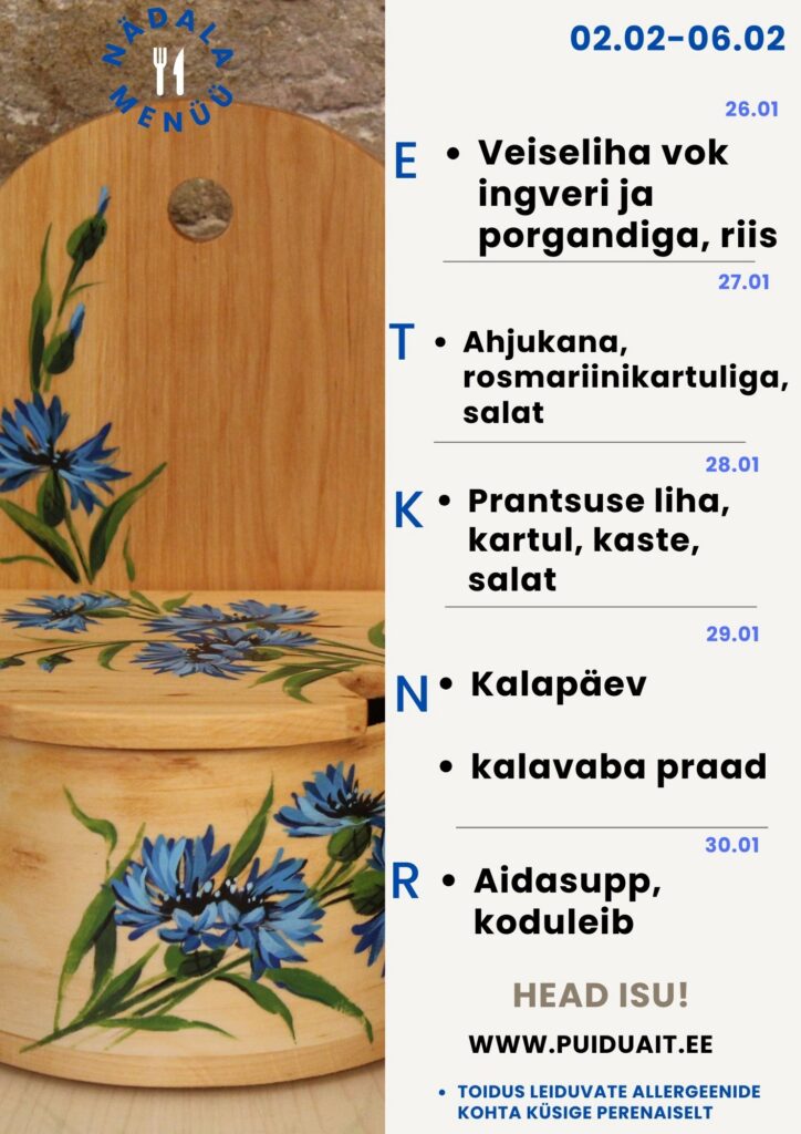 Puiduaida kohvik pakub mõnusaid maitseelamusi. Pakume maitsvaid kooke ja pirukaid, koduleiba ning muud hääd-paremat. Eelneval kokkuleppel saame pakkuda toitlustust kuni 74-liikmelistele gruppidele. Ootame oma sõpru ja külalisi mai algusest septembri lõpuni E–L kell 10–19 P kell 11–17 oktoobri algusest aprilli lõpuni E–R kell 10–17 Muul ajal kokkuleppel. Info ja broneerimine: info@puiduait.ee + 372 33 97 410 Olge valmis vahvateks ja positiivseteks üllatusteks! Menüüd gruppidele: Supp ja magustoit Hind: 4 € Supp valikust: frikadelli, herne või seljanka ja koduleib Magustoit valikust: kohupiim kisselliga või ahjuõunad vaniljekastmes Praad ja magustoit Hind: 5 € 1) Kotlett, kartul, kaste, tomati-kurgisalat, leib Pannkook moosiga, piim 2) Guljašš, makaronid värskekapsa- kurgisalat, leib Marjad kohupiimakastmes 3) Seapraad, kartul, praekapsas, leib Marjad kohupiimakastmes